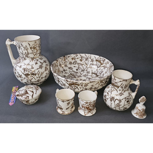 Antique 8 Pc Transferware Bedroom Wash Set Pitchers Bowl Cups Covered Soap Dish
