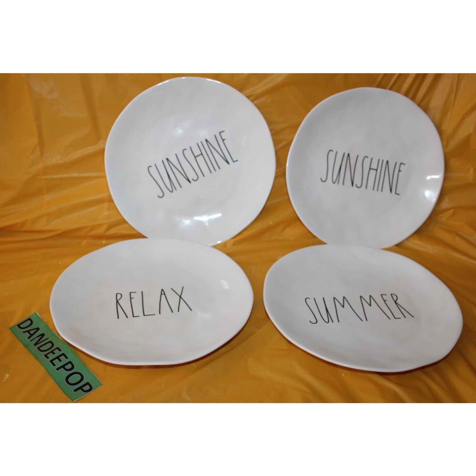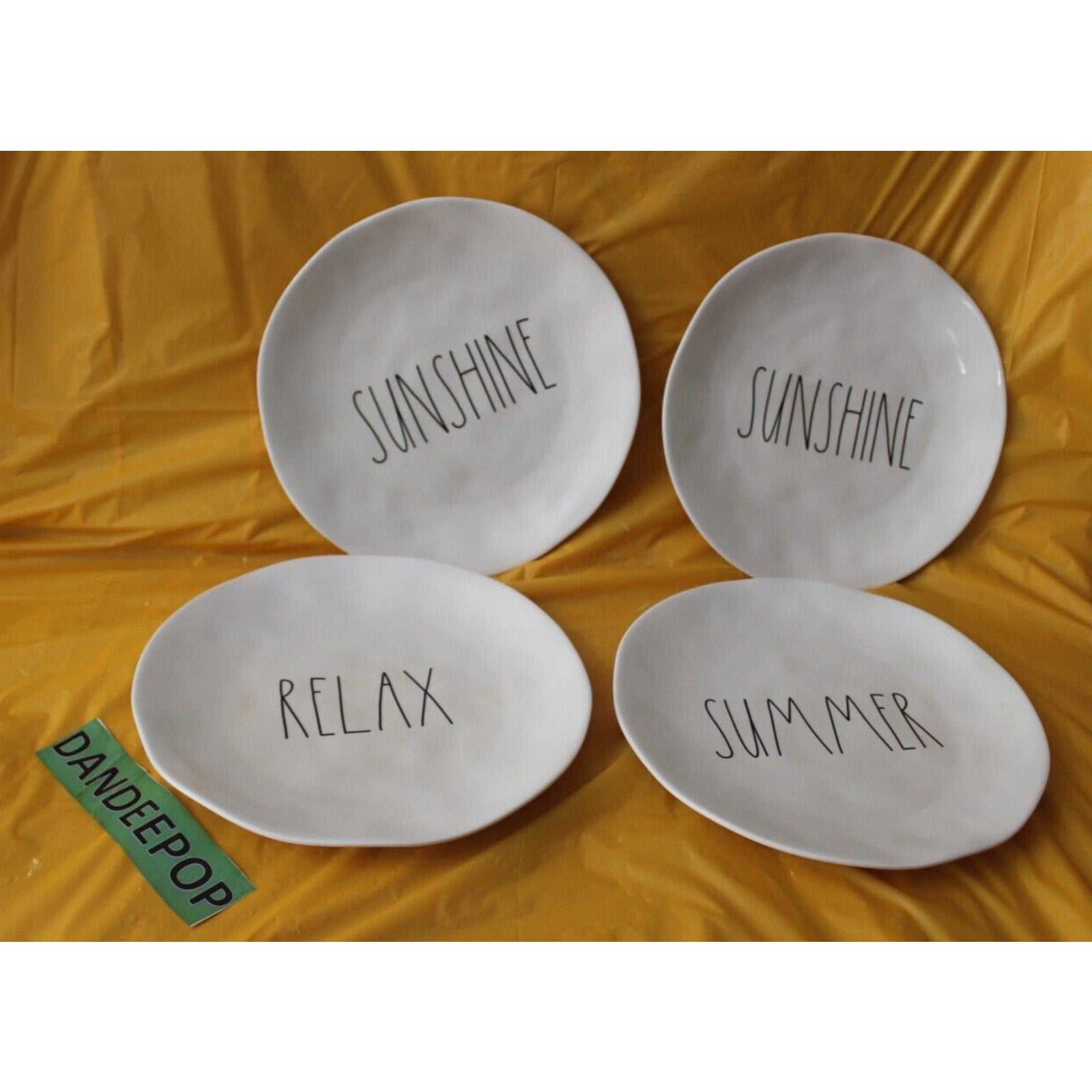 4 Piece Assorted Rae Dunn Magenta Melamine Dinner Plates. There are 2- Sunshine, Relax And A Summer. Each about 10" Round, all need cleaning, minor wear. All comes strictly As Seen. Find This in My Dinnerware And Housewares Category