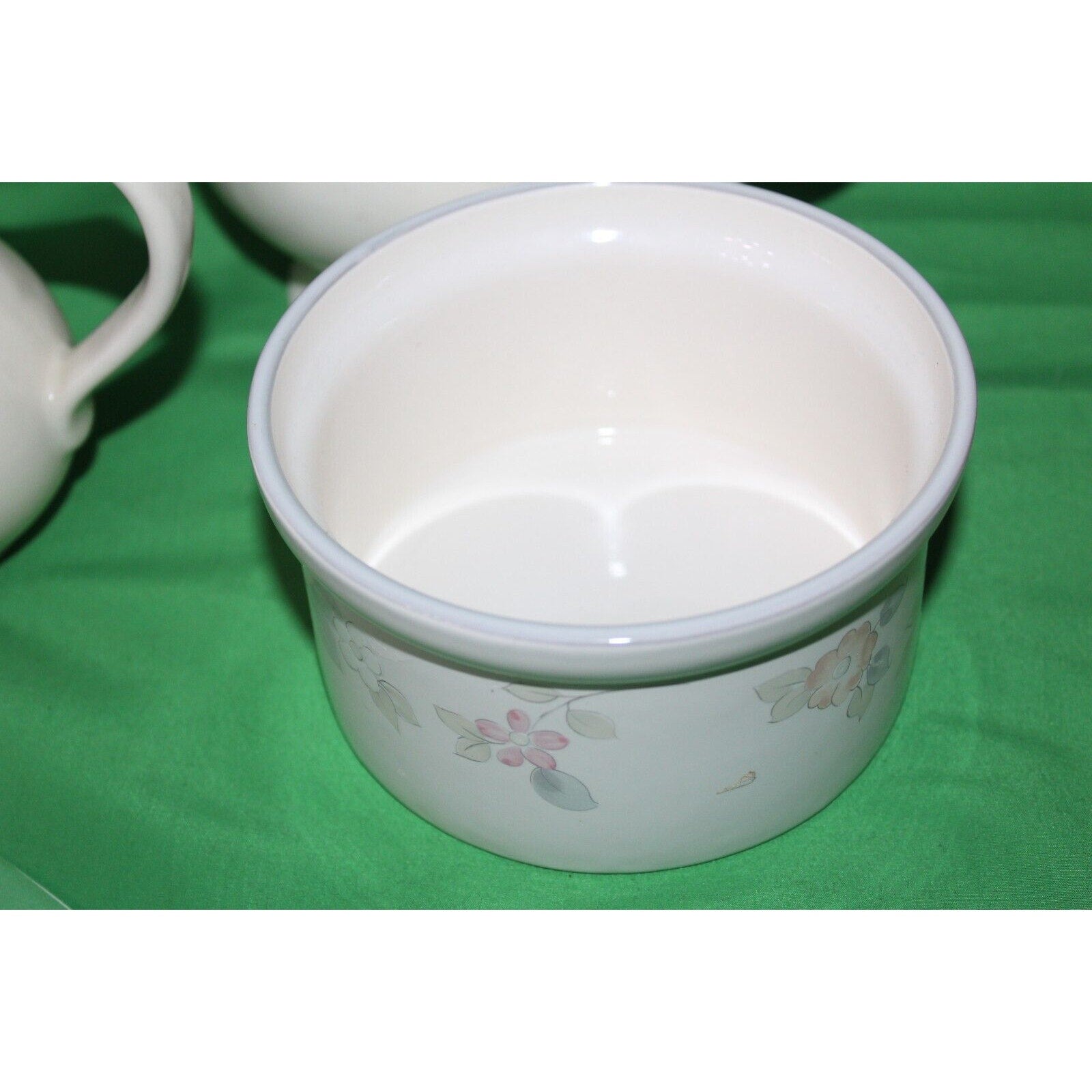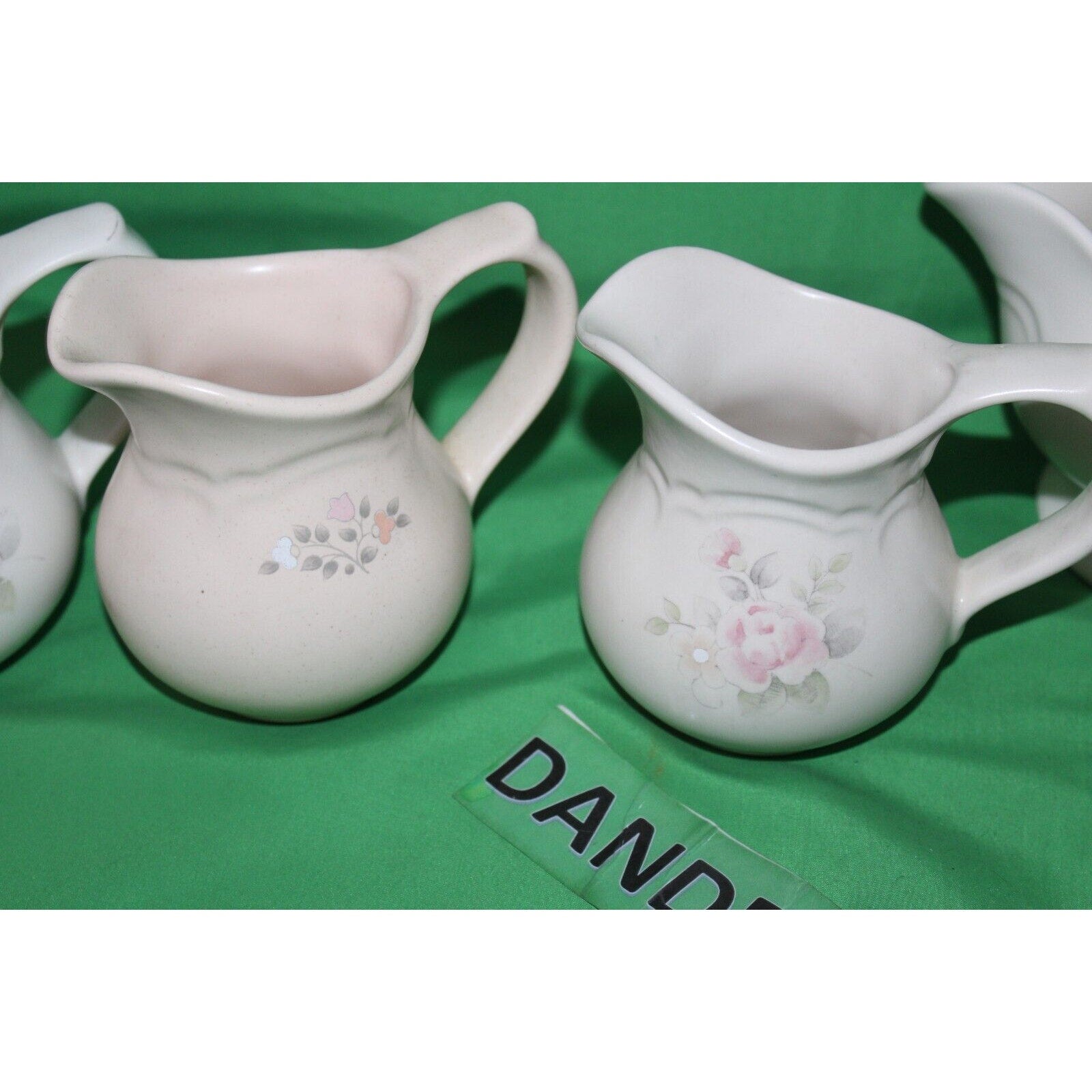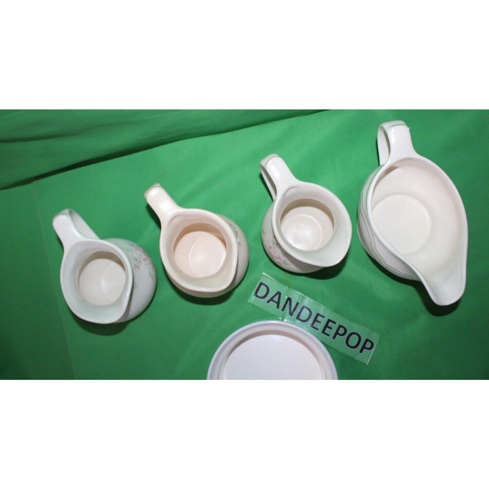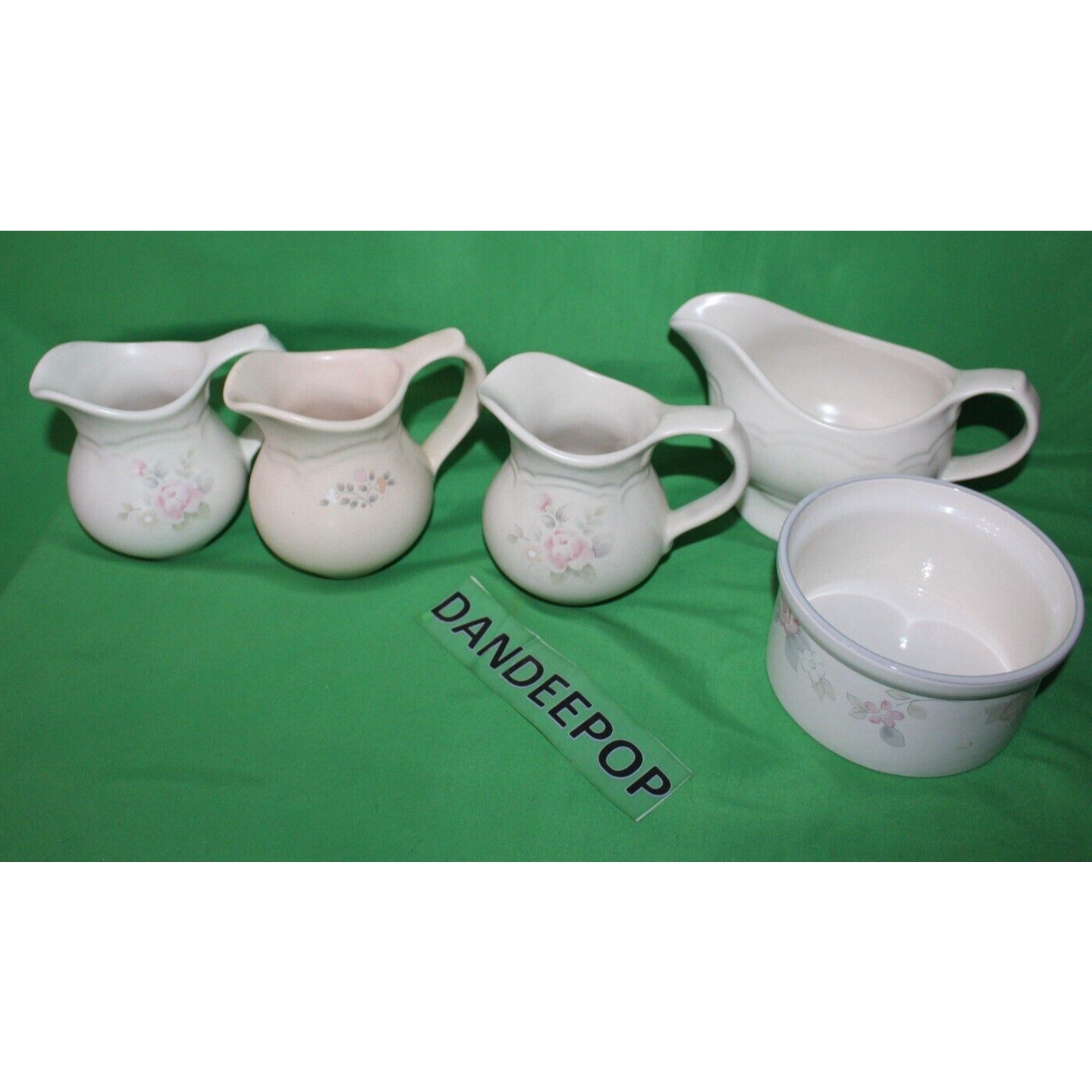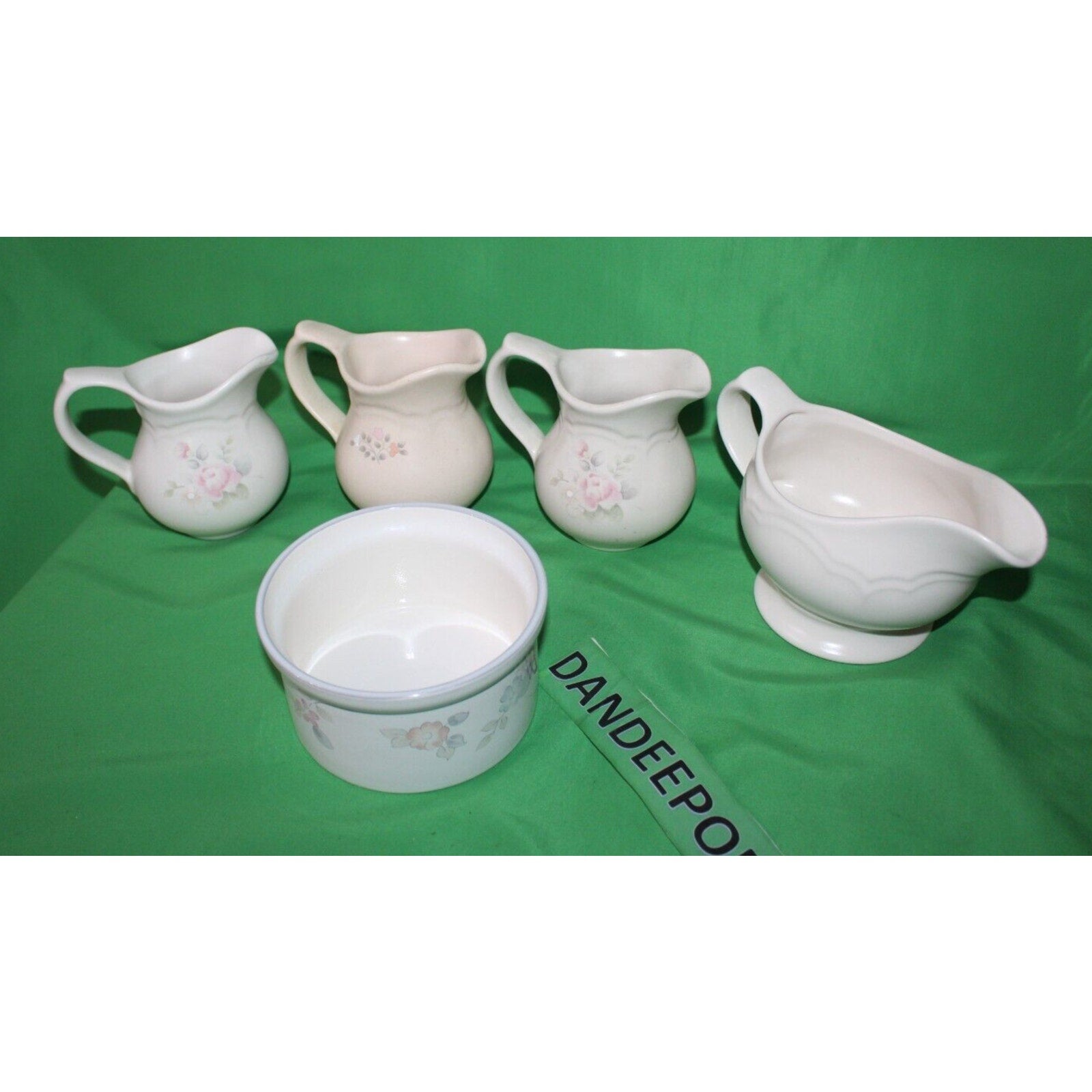 Pfaltzgraff Assorted 5 Piece Pitcher Butter Tub And Gravy Boat. Includes All Shown There is a butter Tub 065 Wyndham, measures about 5 x 3" deep, 2- Tea rose Pattern Creamer pitcher, 1 Original Retired Remembrance Retired Pitcher Creamer, all around 4.5" x 3". Medley Buff Gravy Sauce Boat, measures about 8" Wide, 3.5" tall, 5" inner width. No damages to these, minor shelf wear. Comes As Seen with exception to props and mannequins. Find this in my Dinnerware And Housewares category.