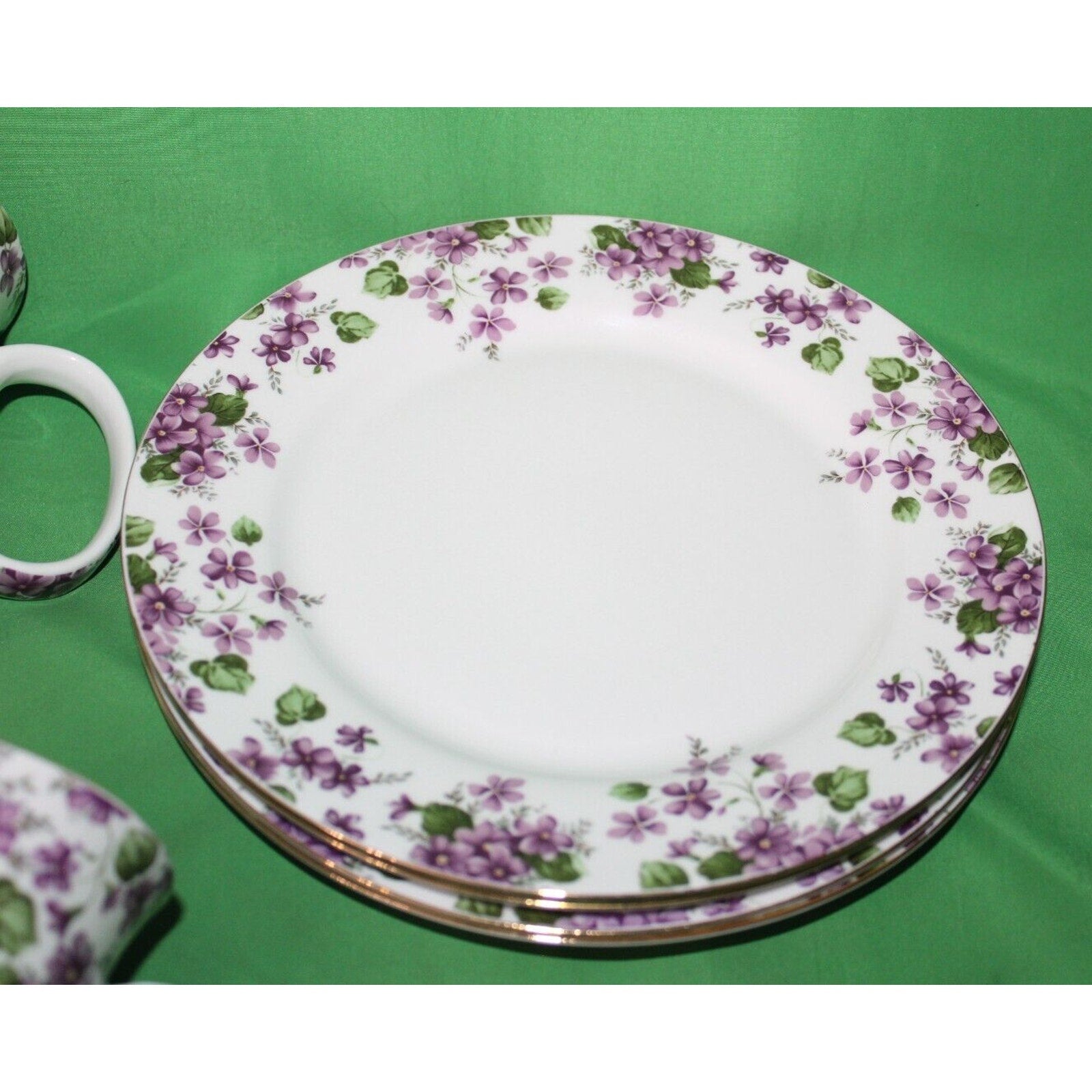 Grace's Teaware Purple Floral Violets 8 Piece Set. There Are 4 Coffee Tea Mugs 4 1/4 x 3" diameter and 4 Snack Lunch Plates 8 1/4" Round 5.5" Center Diameter, All Excellent Conditions, No damages. Comes Strictly as seen with all seen in photos. Find this in my Dinnerware category