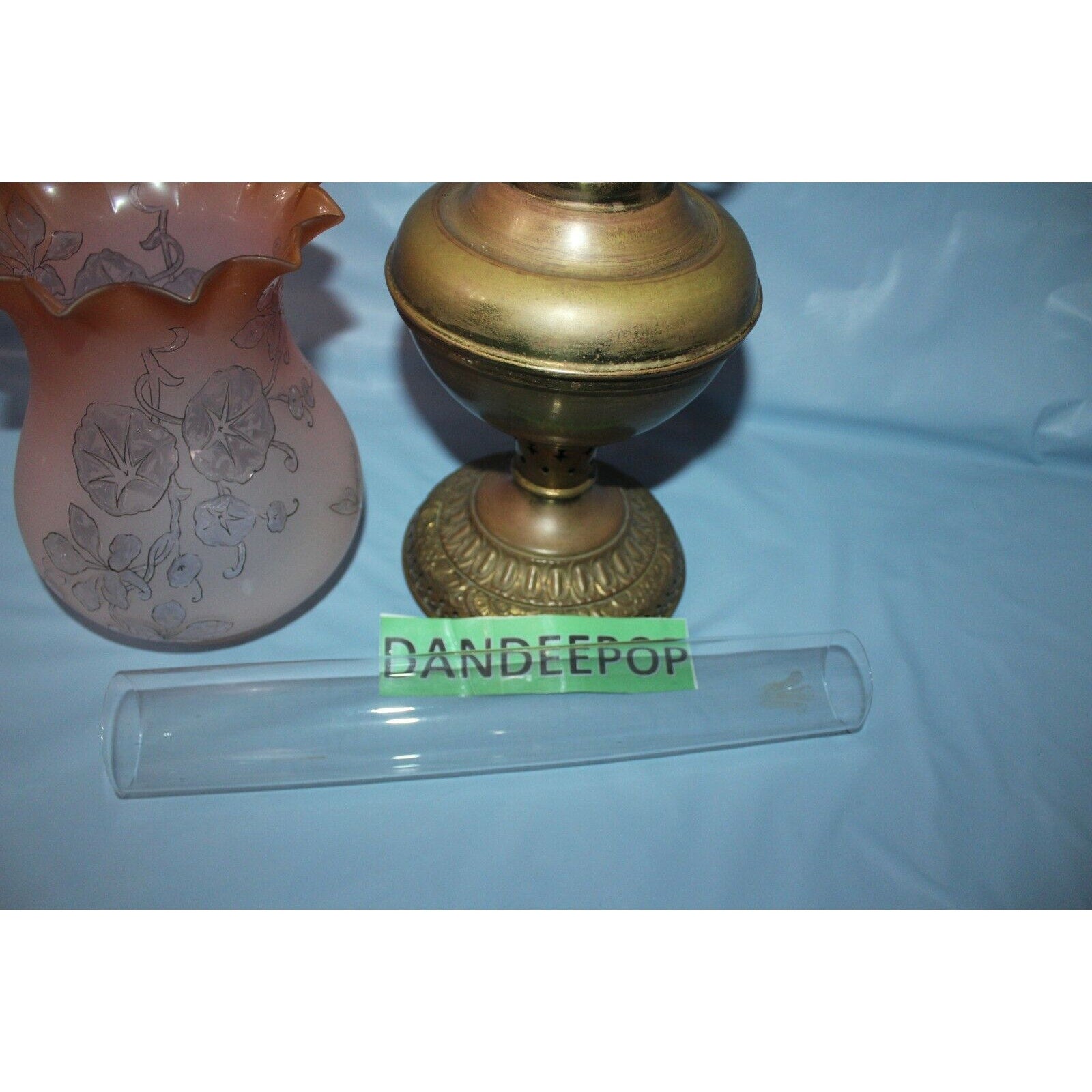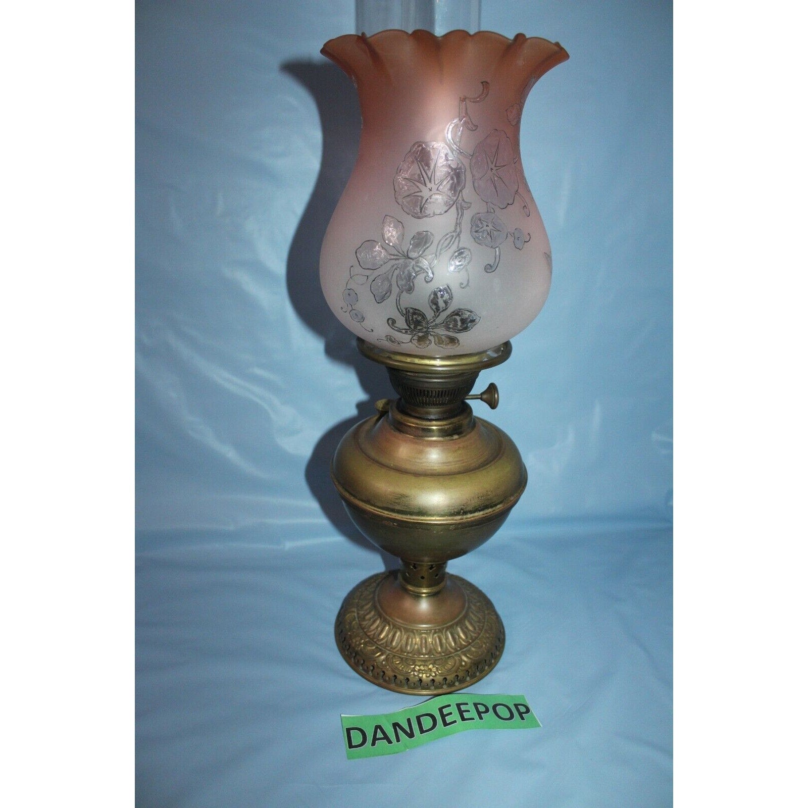 Unique Stunning Antique Estate Kerosene Or Oil Lamp, Brass With Three Feathers Glass Chimney, With Pink Glass Removable Globe Shade. From A Friend's Estate, I have not seen anything to compare this to, all original, table banquet lamp. Uncertain if kerosene or oil, I believe kerosene, has a distinct aroma left on it. The Three Feathers Chimney is perfect, the lettering is worn off a bit. Pink Fluted Decorative glass is about 8" floral and butterfly pattern, 5.5" top opening, 3" bottom opening, there is a tiny chip on the rim bottom as seen in the last photos, unseen when put together. Lamp measures about 24" tall, about 6" base. Brass metal has wear and marks, this is completely untested. Sold as is for use, repair if needed, prop, decoration, collection. No other markings other than the glass tube, the knob has a pattern as seen. Comes Exactly as shown with all shown. Find this in my Antiques And Lamps. category